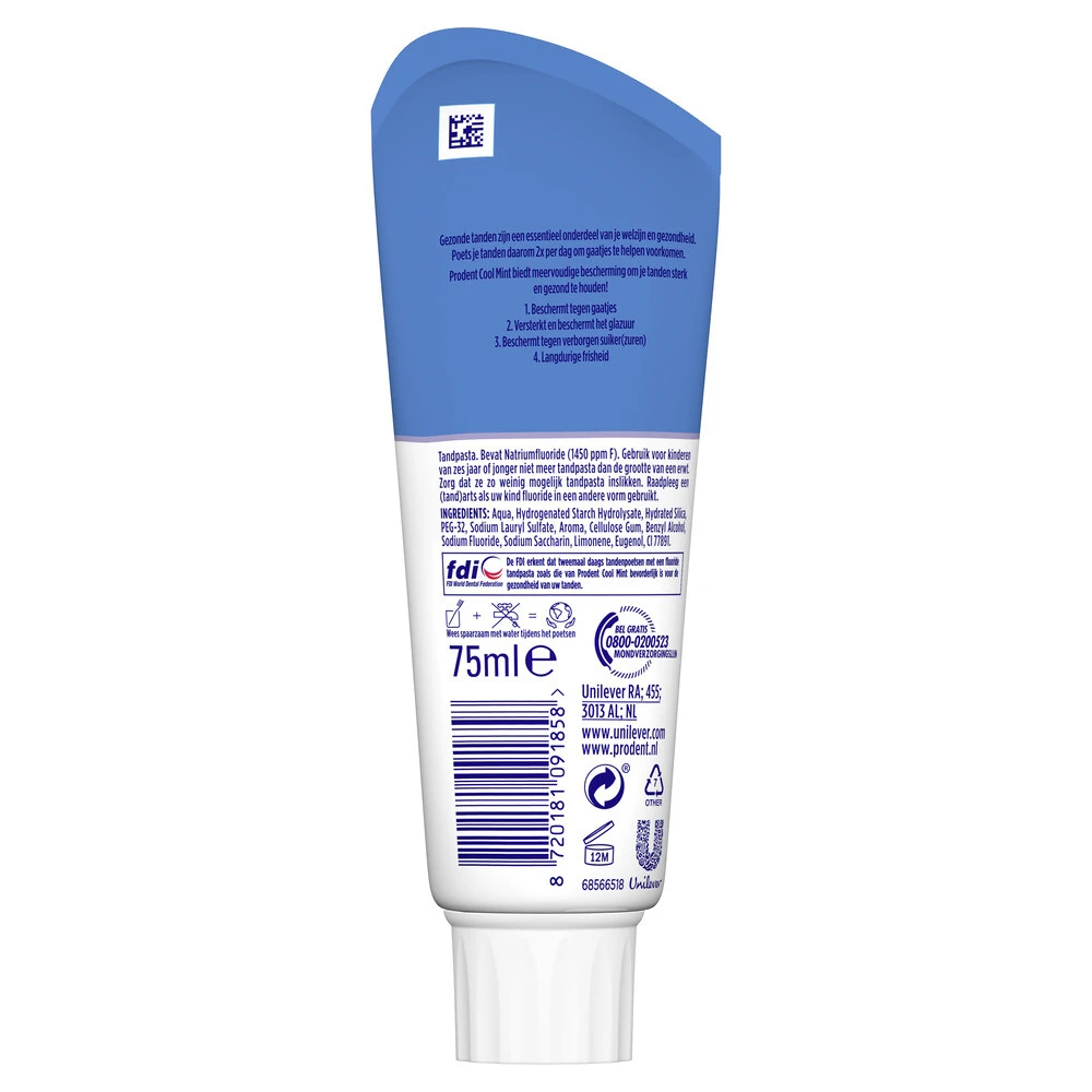 Prodent Tandpasta Cool Mint 75 mlProdent Cool Mint tandpasta voor schone tanden en een frisse adem.Tandpasta met een frisse mint smaak, geeft je diepe, verkoelende frisheidMet viervoudige werking voor schone tanden en een frisse ademDeze tandpasta beschermt het gebit en versterkt het glazuurDeze tandpasta helpt beschermen tegen gaatjes en verborgen suiker(zuren)