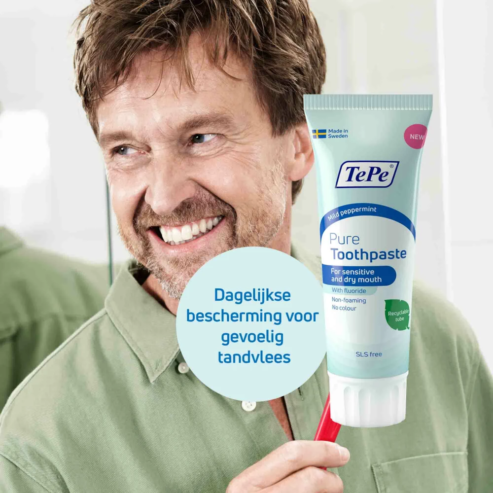 TePe Pure Tandpasta Mild PeppermintTePe Pure TePe Pure tandpasta is een milde tandpasta die speciaal ontworpen is voor mensen met gevoelig tandvlees en/of die de voorkeur geven aan een milde, niet-schuimende tandpasta. De tandpasta heeft een extra milde pepermunt smaak en bevat 1450 ppm fluoride om gaatjes te helpen voorkomen. TePe Pure tandpasta bevat geen schuimmiddel, geen kleurstof, geen microplastic en is vrij van natriumlaurylsulfaat (SLS), een schuimmiddel dat gevoelig mondweefsel kan irr