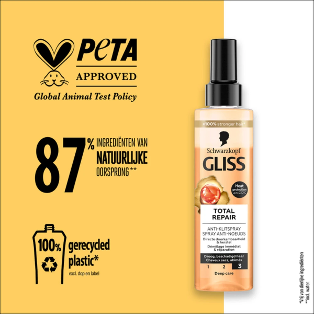 Gliss Anti-klit Spray Total RepairZorgt voor directe doorkambaarheid van het haar. De formule bevat gehydrolizeerde keratine en bloemennectar. De Total Repair lijn is ontwikkeld voor het herstel van droog en beschadigd haar.De anti-klitspray zorgt voor een directe doorkambaarheid van het haar.De formule bevat 90% ingrediënten van natuurlijke oorsprong*. (*incl. water)De anti-klitspray biedt bescherming tegen haarbreuk.Speciaal ontwikkeld voor het herstellen van droog en beschadigd haar.De f