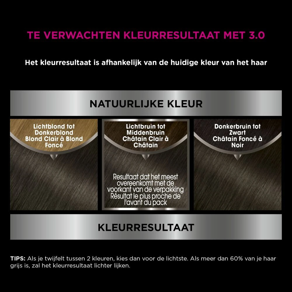 Garnier Olia 3.0 Donkerbruin Haarkleuring:- Intense, levendige en langhoudende kleur- Zichtbaar verbeterde haarkwaliteit, kleur na kleur- 3x Glanzender haar**- 35% zachter haar**- Zonder ammoniak voor een aangename geur- Tot 100% GrijsdekkingErvaar nu de kracht van pure oliën met Garnier Olia!De permanente thuiskleuring met 100% grijsdekking op basis van 60% oliën* geeft het haar een intense kleur, een schitterende glans, en zichtbaar verbeterde haarkwaliteit, kleur na k