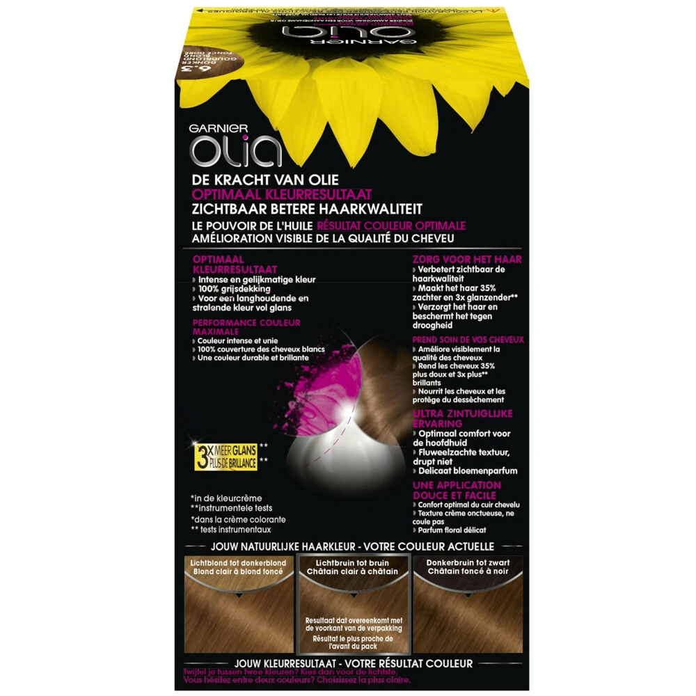 Garnier Olia 6.3 – Donker GoudblondErvaar de Olia haarkleuring van Garnier voor een prachtig resultaat. Door het gebruik van oliën wordt een optimale kleuring van de haarvezel bereikt en wordt de kwaliteit van het haar zichtbaar verbetert. En de Olia haarkleuring bevat een fijn subtiele geur.100% grijsdekkingVerbetert zichtbaar de haarkwaliteit35% zachter en 17% glanzender haarMaakt tot wel 3 tinten lichterOlia van Garnier is een haarkleuring die gemakkelijk en prettig is aan te breng