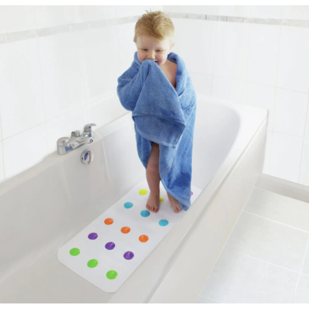 Munchkin BadmatVeiligheid komt op de eerste plaats bij badtijd. Maar het moet ook leuk zijn! Daarom heeft Munchkin deze leuke antislip-badmat met stippen gecreëerd. Het getextureerde antislip-opervlak in zuurtjeskleuren voorkomt uitglijden, en de slipbestendige zuignappen houden de mat stevig op zijn plaats. Bovendien is deze mat superschattig – net als jouw kleintje!Antislip-oppervlakSlipbestendige zuignappen houden de mat op zijn plaatsSchattig en kleurrijk stippendesign76 cm x 37 cmLeeft