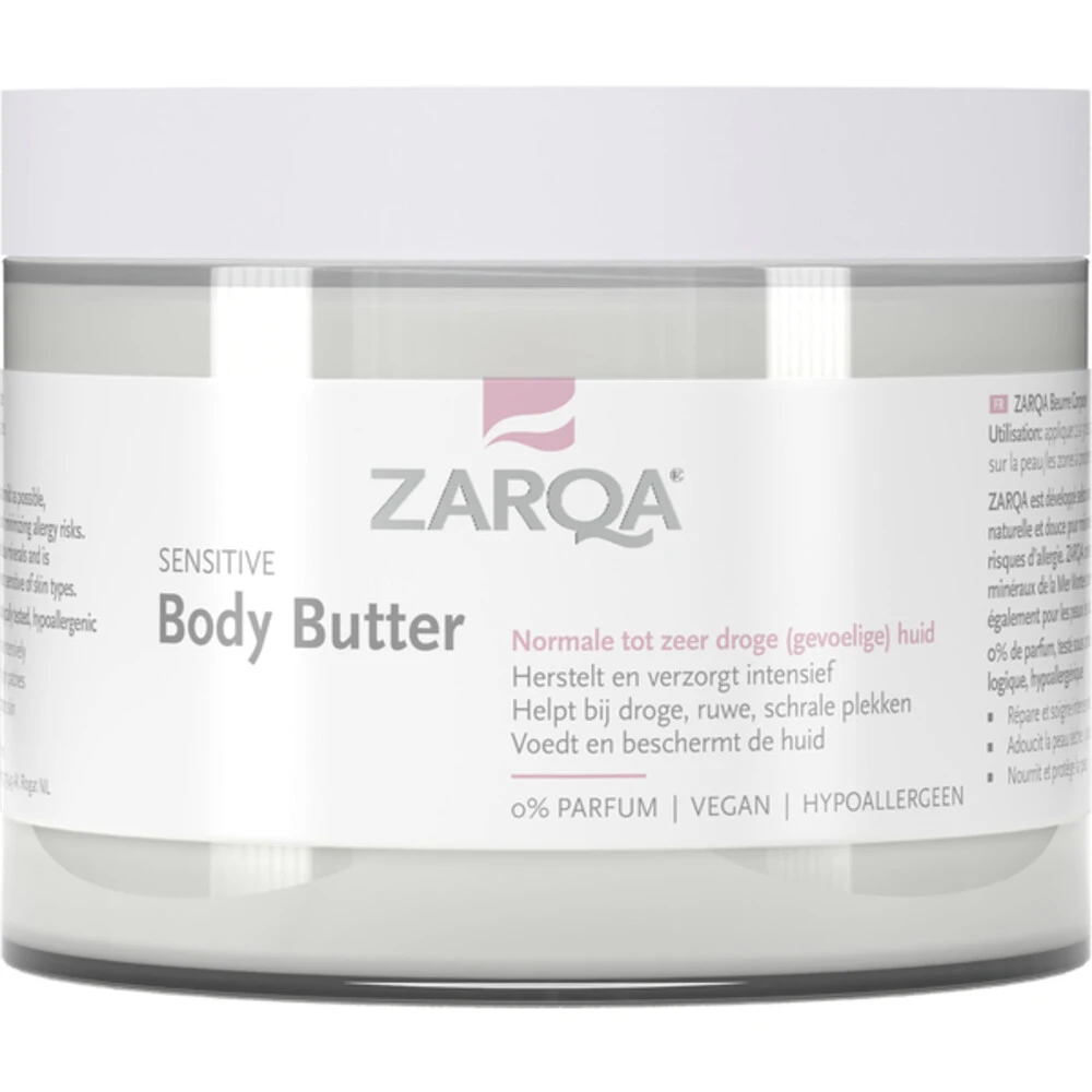 Zarqa Body Butter Sensitive Zarqa Body Butter verzorgt de huid intensief op basis van Dode Zeezout, -mineralen en shea butter. De rijke boter herstelt en kalmeert de (zeer) droge en gevoelige huid en voorkomt en bestrijdt kloofjes, schilfertjes en een ruwe huid. De huid voelt zacht, soepel en goed gehydrateerd aan, de hele dag door.Herstelt en verzorgt intensiefHelpt bij droge, ruwe, schrale plekkenVoedt en beschermt de huid0% ParfumVeganHypoallergeenMet Dode Zee mineralen